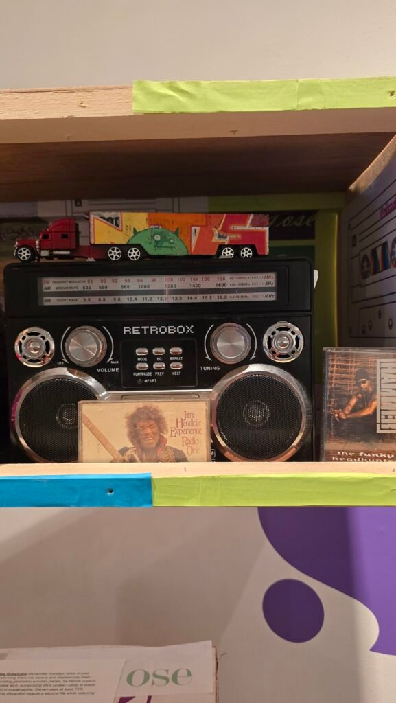 Constructed using 75% or more reused and reclaimed materials, the sculpture reflects a consistent baseline within the artist’s broader practice. Wood, found objects, analog technology, and everyday artifacts are intentionally repurposed, extending the life of materials while carrying traces of previous use.