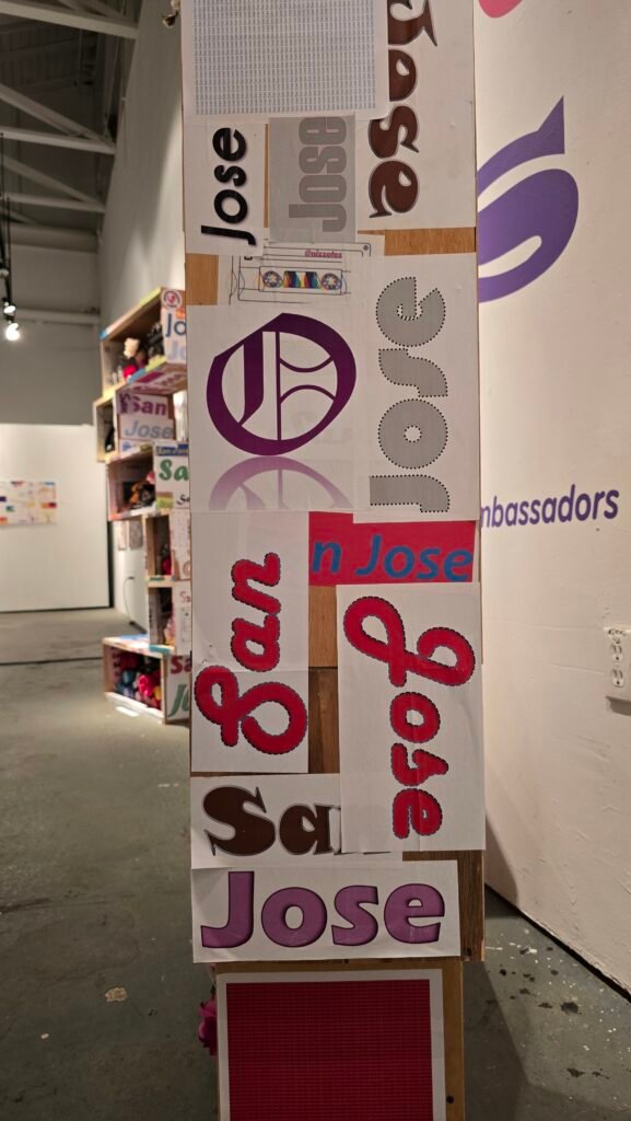The sculpture was conceived and constructed by Steven nizzotes Rubalcaba and first activated during San José Day in 2025. Attendees were invited to contribute by selecting, arranging, and wheatpasting printed variations of the words “San José” in multiple fonts, colors, and scales onto the surface of the letter forms. Through this public collage process, the sculpture became a co-created surface shaped by many hands.