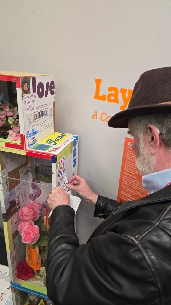 Throughout the evening the surface of the sculpture gradually transformed as each contribution was added, creating a growing collage of community memories. The activation was documented through photography, short video clips, and a time-lapse recording capturing the evolving surface of the work.