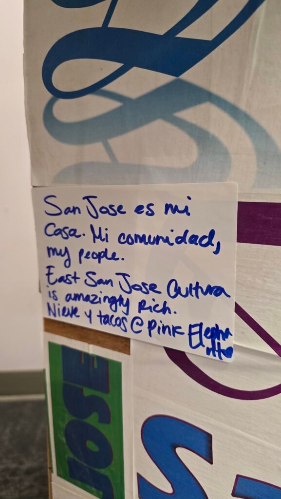 Visitors were invited to write, draw, and collage blank labels onto the sculpture. Participants shared memories of San José, referenced neighborhoods and local landmarks, and added personal reflections connected to the city. Many contributors experimented with the materials — drawing on stickers, cutting custom shapes, and layering them onto the sculpture in playful and inventive ways.